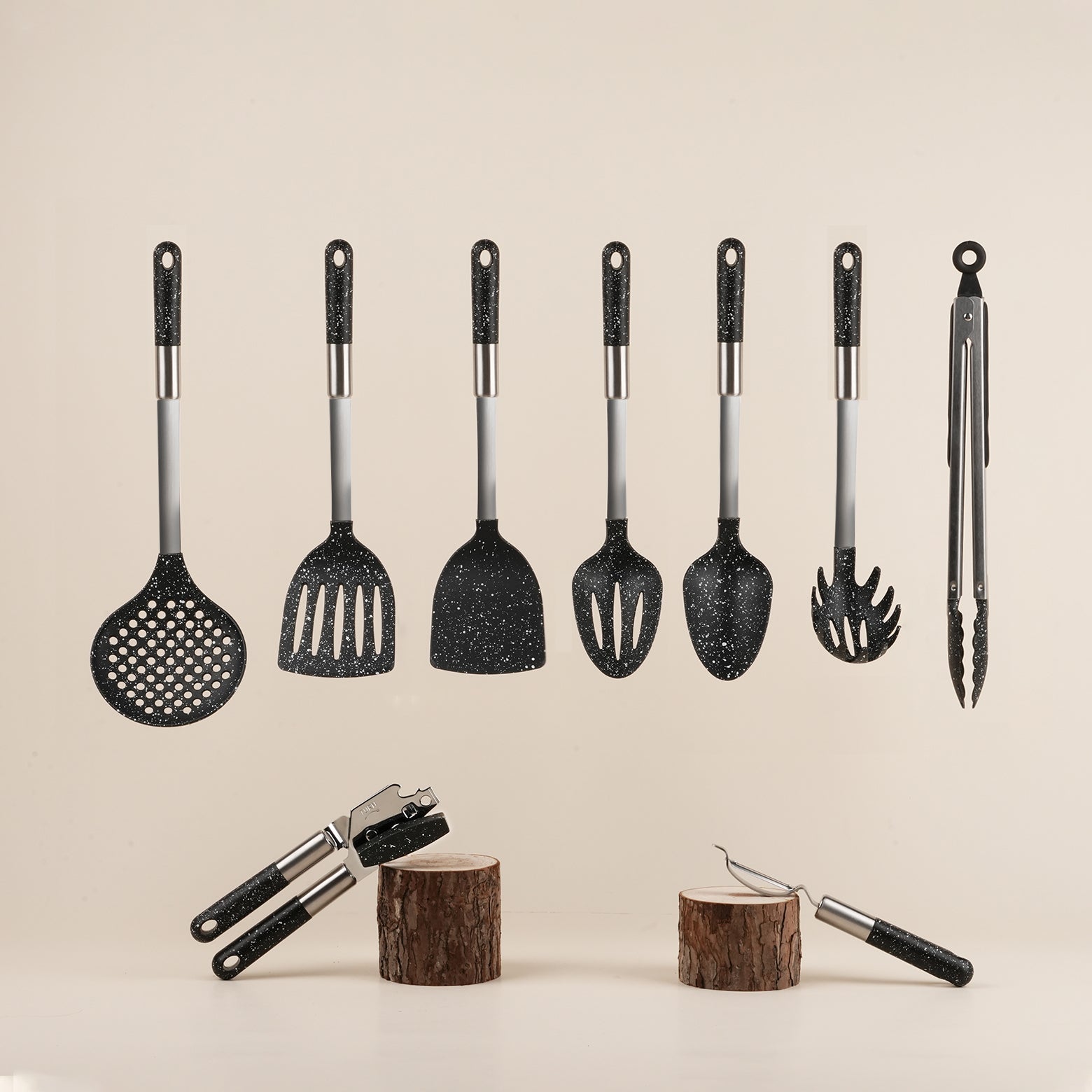 Elegant 9 Pcs Black Kitchen Utensil Set with White Speckles